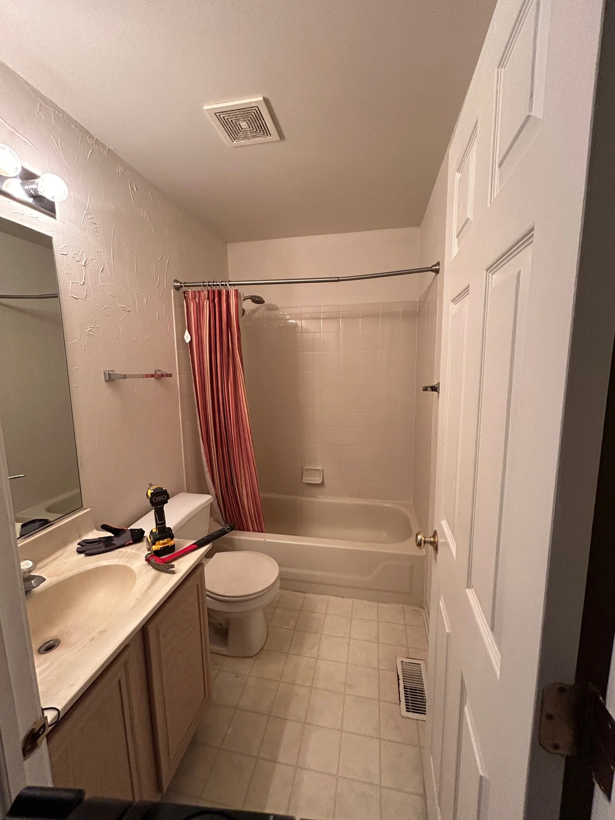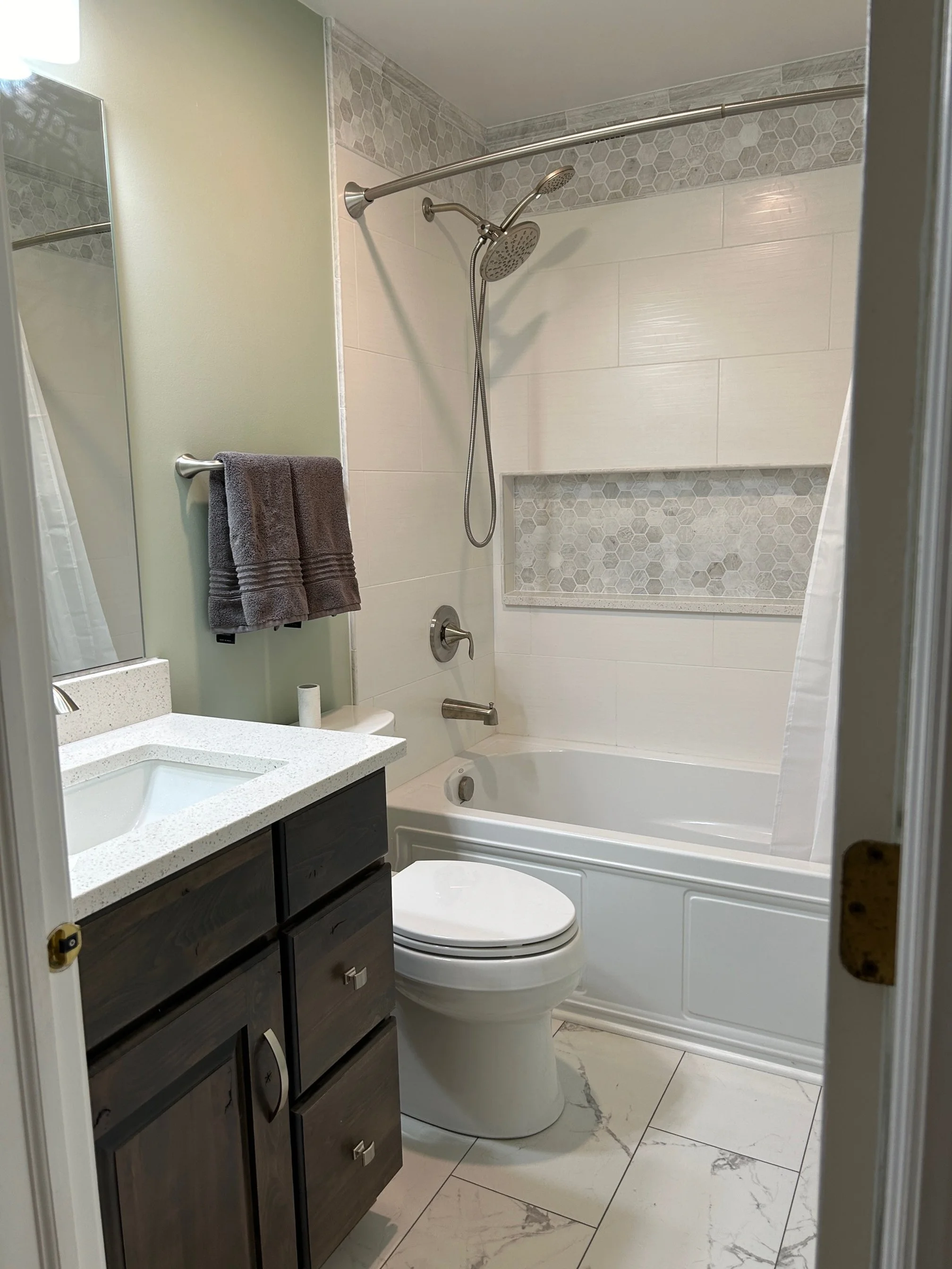 For this guest bathroom, Kalus tore out the entire bathroom, and replaced it all with new fixtures, minor plumbing upgrades, new tile shower surround and tub, a new vanity, and tile floors.